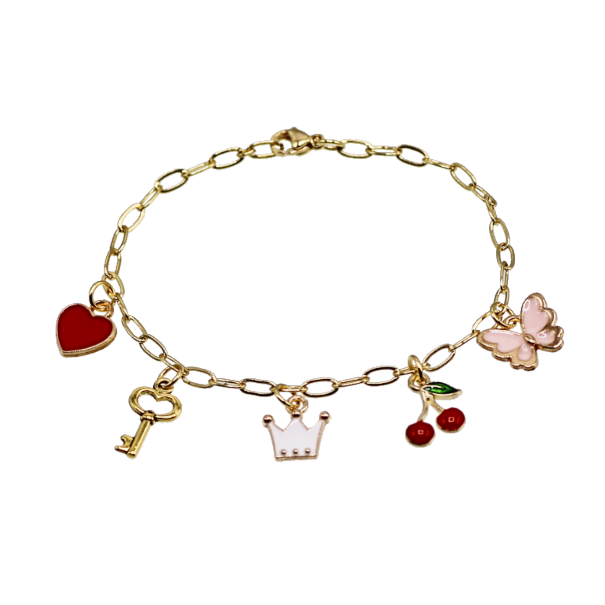 This bracelets is one of our most enjoyable products, fun to make and exciting to personalize. The charms on the bracelet are subject to change, from our wide range of charms, including butterflies, hearts, bows and more exciting things. If you have anything specific in mind, please contact us.