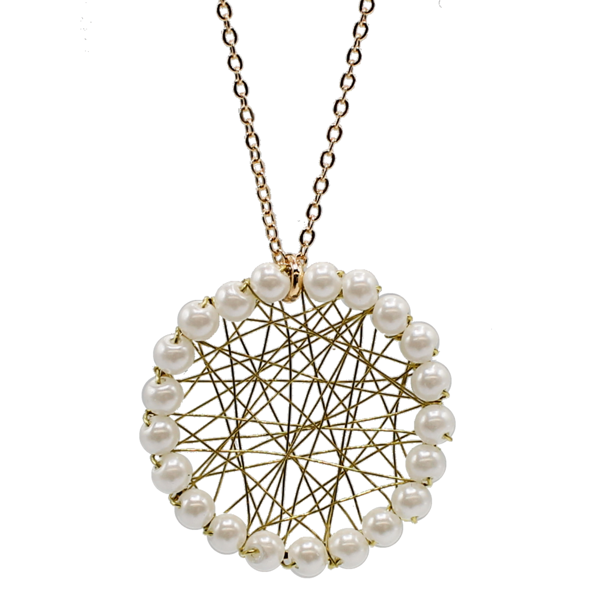 This pendant will add to any outfit with the classy pearls combined with the unique mesh.